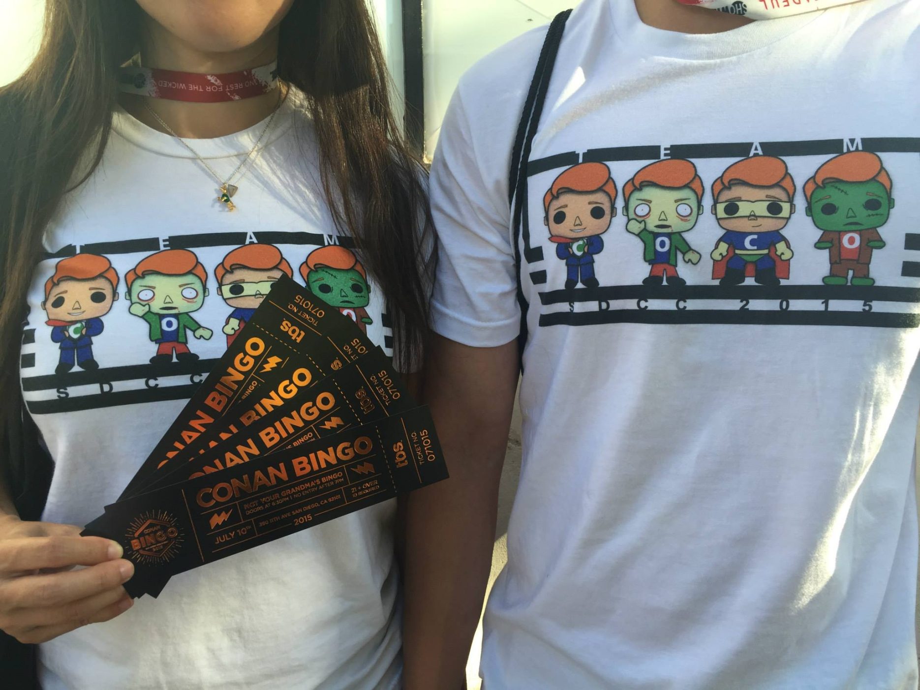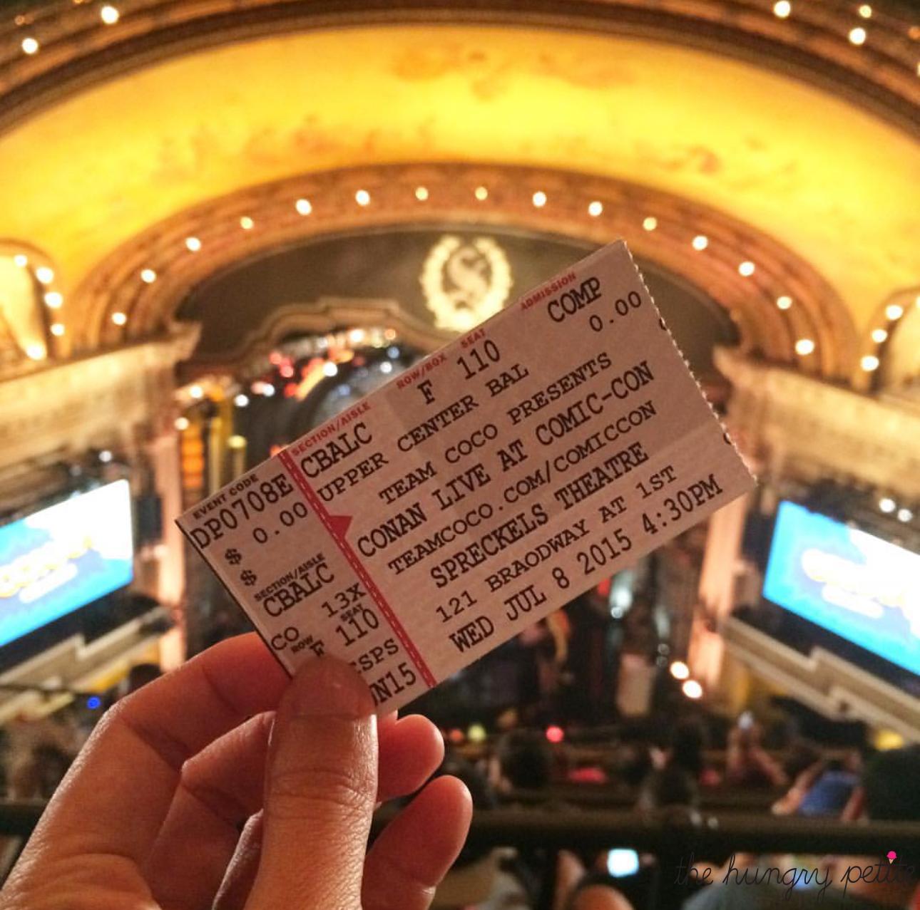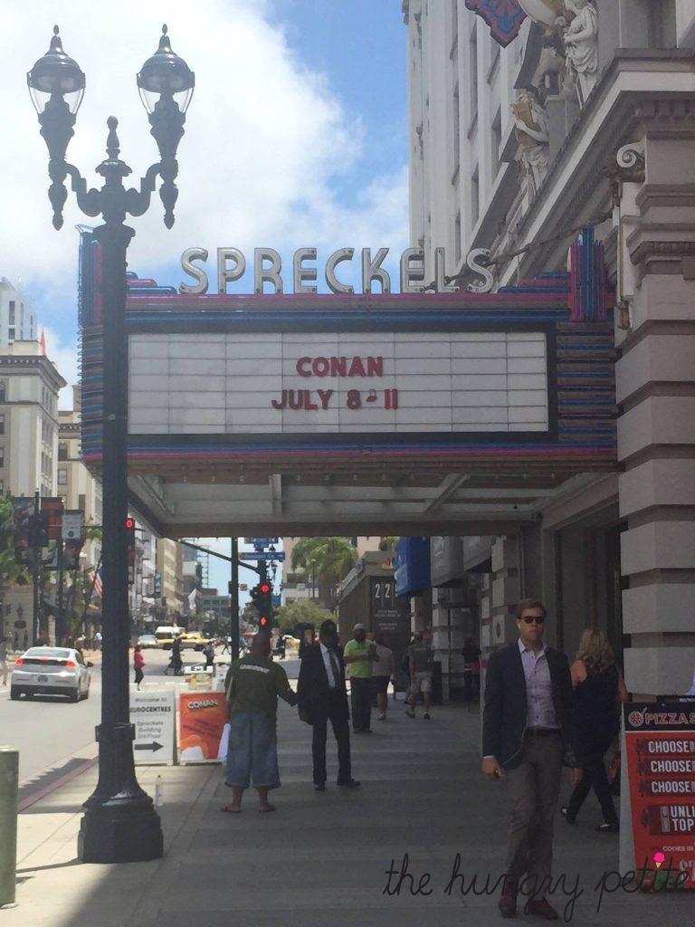 Conan brought his TBS show CONAN to San Diego and taped a full week of episodes during Comic-Con. From Wednesday, July 8 through Saturday, July 11, the show took over the Spreckels Theatre, becoming the first late-night talk show to commit to multiple SDCC tapings on site. My SIL made Conan Funko Pop! t-shirts for us to sport at the show; we were the coolest Conan fans in the theatre (ha!).