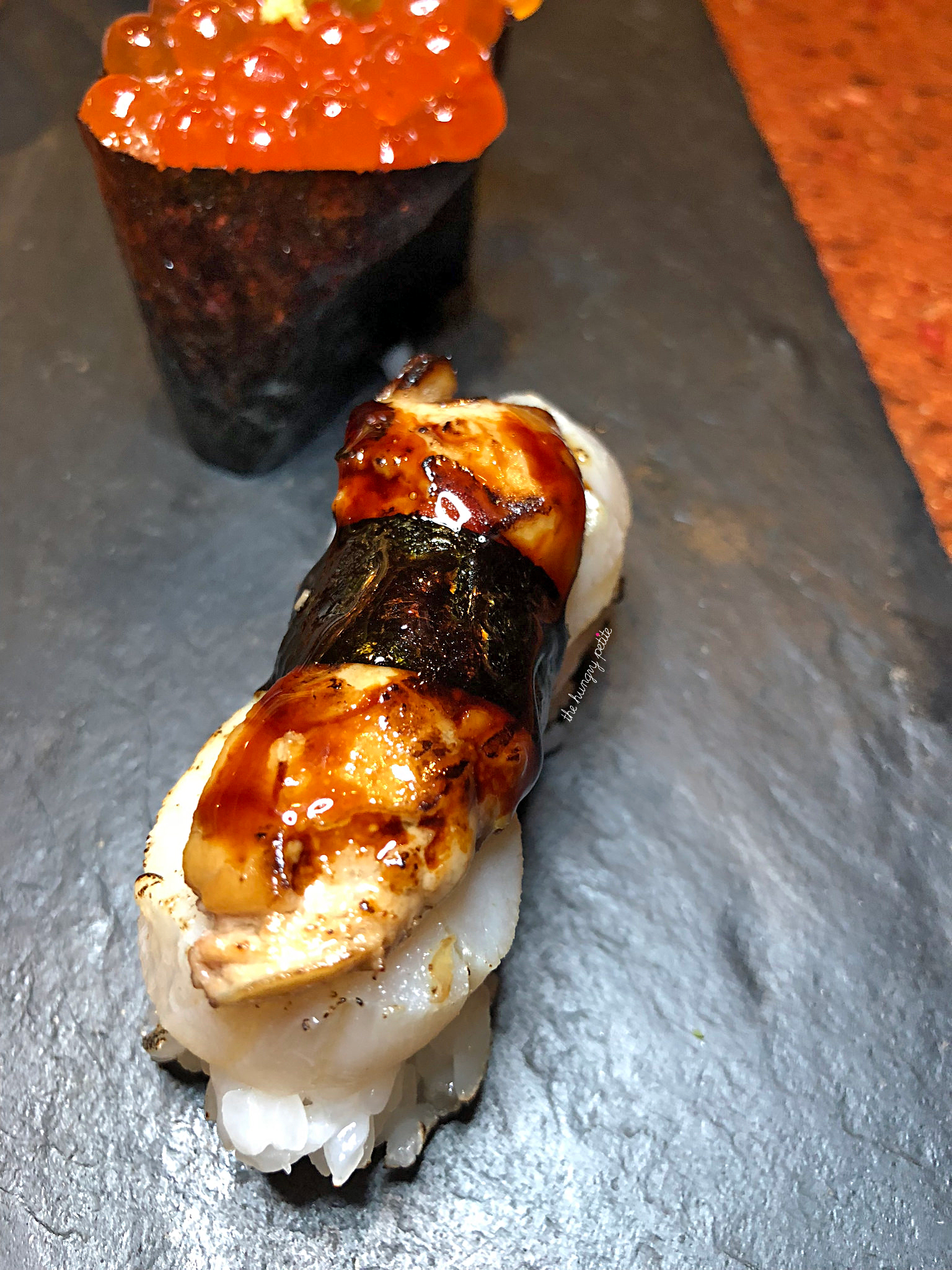 Foie Gras + Scallop Sushi and Ikura (Salmon Roe), both from the regular menu. The foie is a favorite of ours and we always order it. I like Ikura, but not in “large” amounts like this, so we only ordered one of that (for my husband). How can I not love Ikura? It stems from my trip to Japan’s Tsukiji Fish Market 13 years ago. I wasn’t much of a sushi lover back then, and trying to stomach an omakase at 7am was a difficult feat for a novice foodie. I ate as much as I could, but shoving a handful of Ikura into my mouth on a full stomach and a throatful of fish left me gagging. I remember that vividly, and I think of it every time I see Ikura.