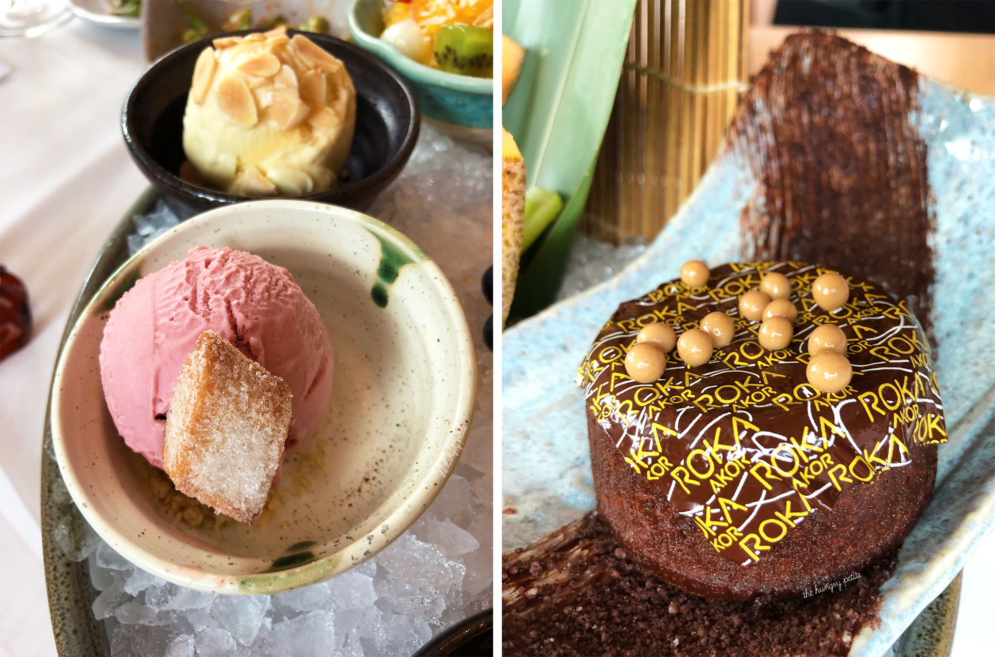 House-Made Sorbet and Ice Cream and Warm Valhrona Chocolate Cake with Almond Caramel and Vanilla Ice Cream.